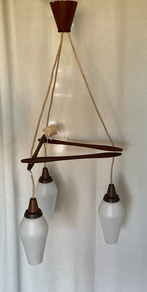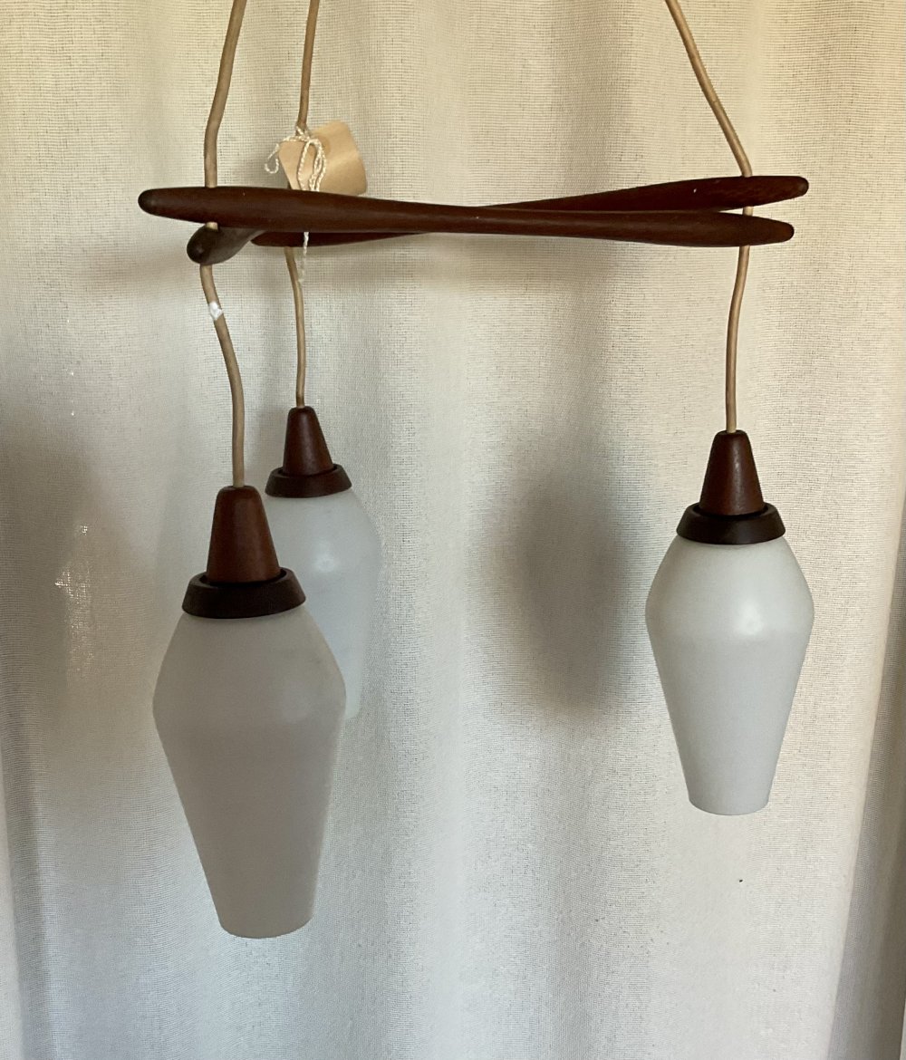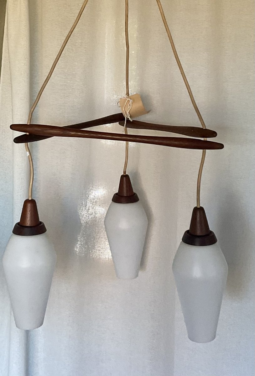 Retro loftpendel med teak og 3 opalglas h ca 85 incl teak fatning, B 3x45 cm, et opalglas er ca 25 cm incl teak, sælges 1250,-kr . Et mini nag se foto. #retropendel#retroloftlampe#teakogopalglaslampe#vintagependel#opalglas#teak#