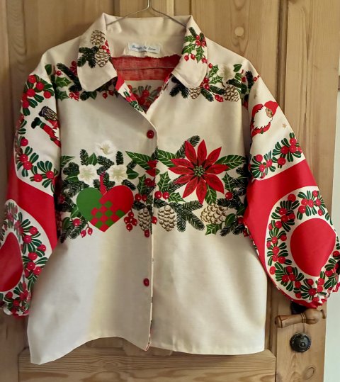 Ny pris! Flot bluse til julefrokosten! Syet af retro julestof i eget design, Design [...]by Jane, str M-L med trekvart ærmer sælges 675,-kr,#julebluse#bluseafjulestof#juledug#jul#bluse#recycling#genbrug#designbyjane#Læs mere...↑ |  |  | | | |